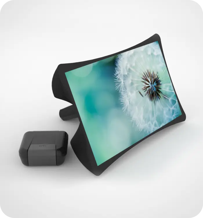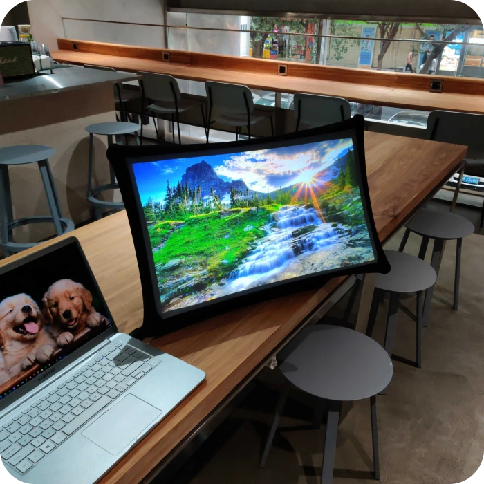Our Patented Nanomaterial screen is wrinkle-resistant, smudge-proof, flexible and produces a crystal clear 24.5" image in display mode and up to 80" image in projector mode.