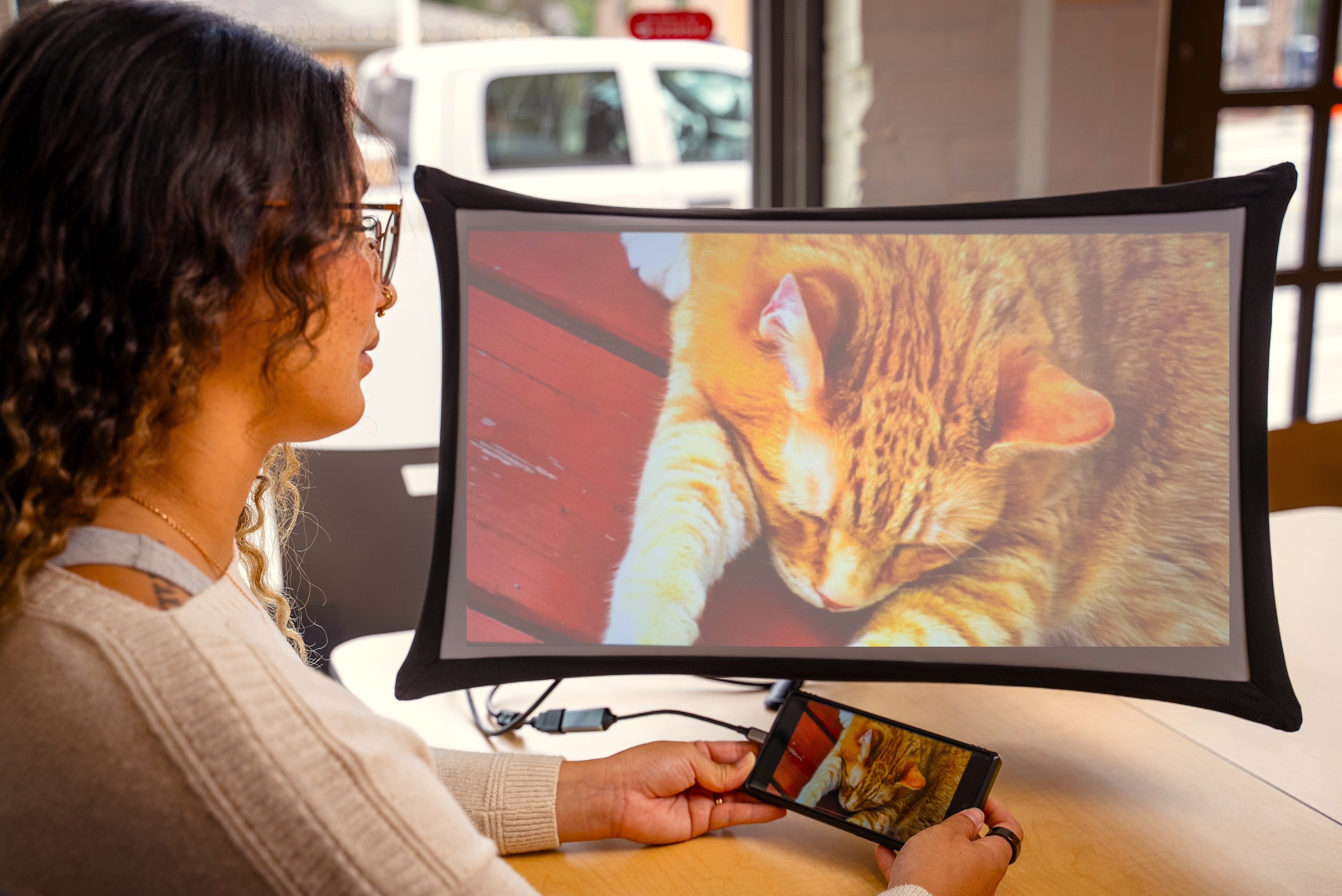 If you struggle to look at screens all day, Splay is for you. Splay is a versatile 2-in-1 large screen display and projector that easily pairs with any computer, laptop, phone, tablet, or magnifier. By combining expansive, eye-friendly screens with an ultra-portable, foldable design, Splay provides an accessible and highly comfortable viewing experience for users in the low vision community.